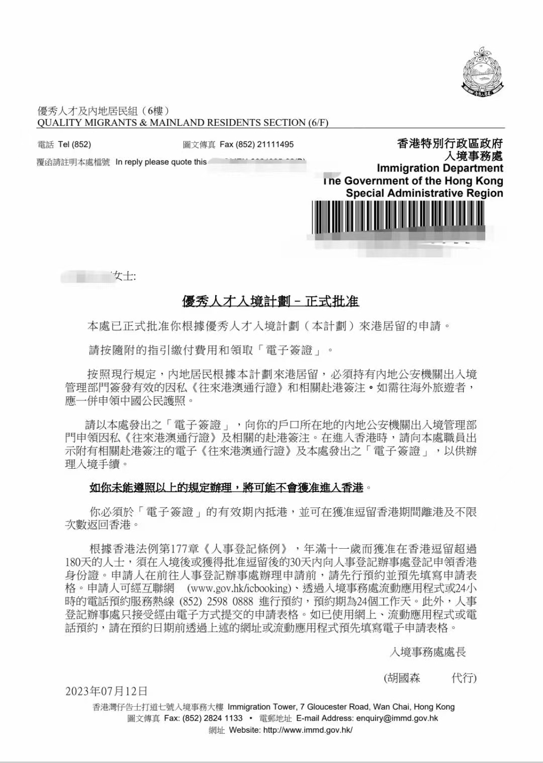 2023年7月12日取得優(yōu)秀人才入境計(jì)劃-正式批復(fù)函。