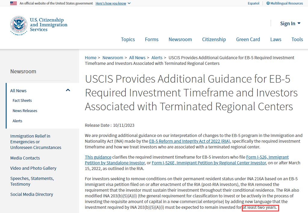2023年10月11日,美國(guó)移民局USCIS通過官網(wǎng)發(fā)布了有關(guān)新法EB-5最低投資期的新政策,宣布新法EB-5的最低投資期為兩年。