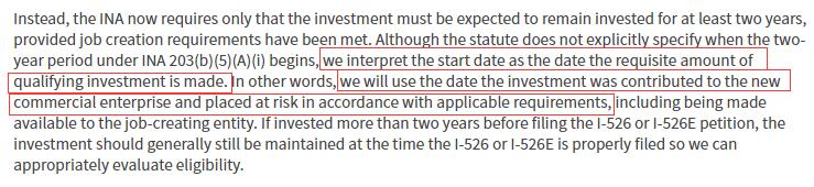 對(duì)此USCIS的解讀是,投資人完成符合要求的投資日期將作為兩年投資期起始時(shí)間,也就是說(shuō),EB-5投資款進(jìn)入NCE(新商業(yè)企業(yè))并根據(jù)適用要求提供給JCE(就業(yè)創(chuàng)造企業(yè))成為有風(fēng)險(xiǎn)投資的日期才是兩年投資期的起始時(shí)間。