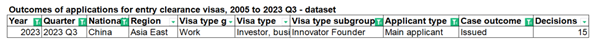 從上文數(shù)據(jù)可以看出,2023年第三季度,創(chuàng)新創(chuàng)始人簽證共計遞交102人,其中中國大陸遞交17人,獲批15人。