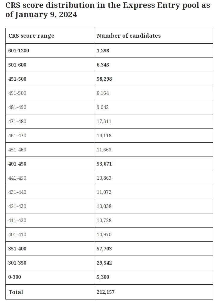 目前,IRCC正在努力處理池中的快速通道候選人。池中候選人分?jǐn)?shù)和人數(shù)分布情況如下: