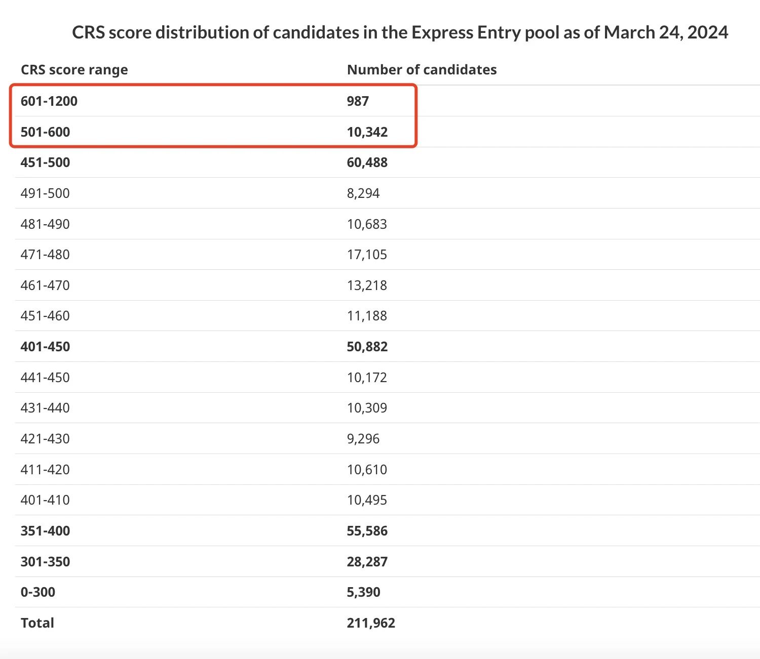 目前,IRCC正在努力處理池中的快速通道候選人。池中候選人分?jǐn)?shù)和人數(shù)分布情況如下:
