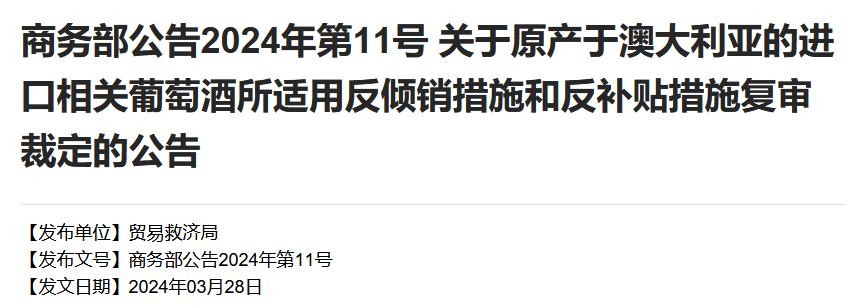 3月28日,中國商務部發(fā)布了一則公告,自2024年3月29日起,取消對澳洲葡萄酒的反傾銷關稅。以下是公告原文:(摘自中華人民共和國商務部官網(wǎng))