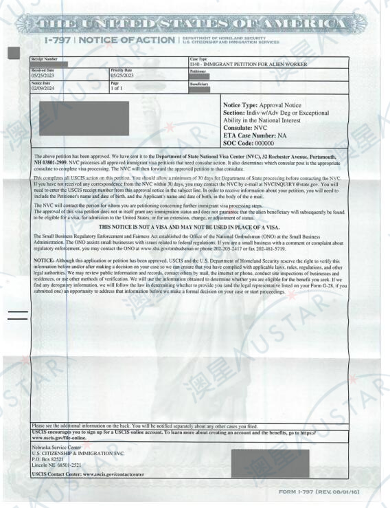 Y先生于2022年10月與我司正式簽訂合同,委托我司辦理美國NIW的申請事宜,移民局于2023年5月25日成功接收我們?yōu)閅先生遞交的 I140 申請,并于2024年2月9日一次性獲批。