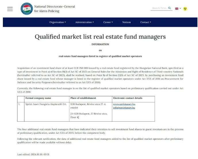 由于受到歐盟及國家的嚴格審查管理,直到2024年10月29日,匈牙利政府終于批準了其外國投資者計劃(Guest InvestorProgram)下的首支基金,并在官網進行了公布。這也意味著,匈牙利“黃金簽證計劃”正式開售!