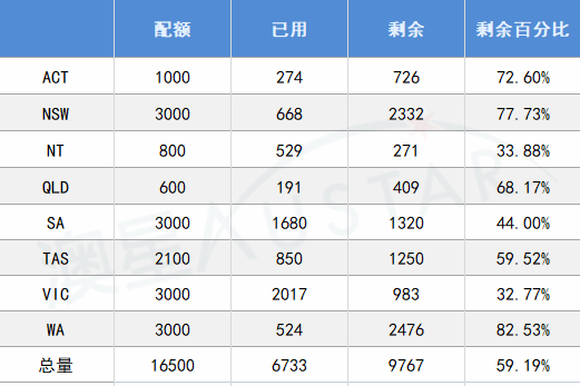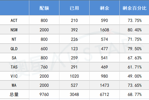 2025-26財年過半,澳洲移民局昨天(2025.01.20)正式公布了本財年各州州擔保剩余配額數(shù)量。截至至2024年12月31日,各州州擔配額使用情況如下:
