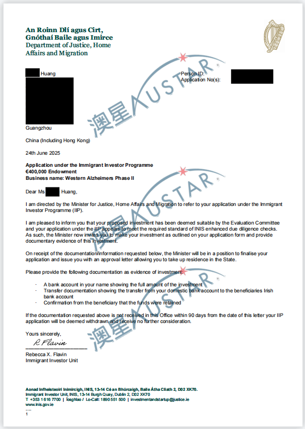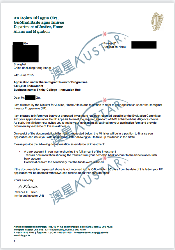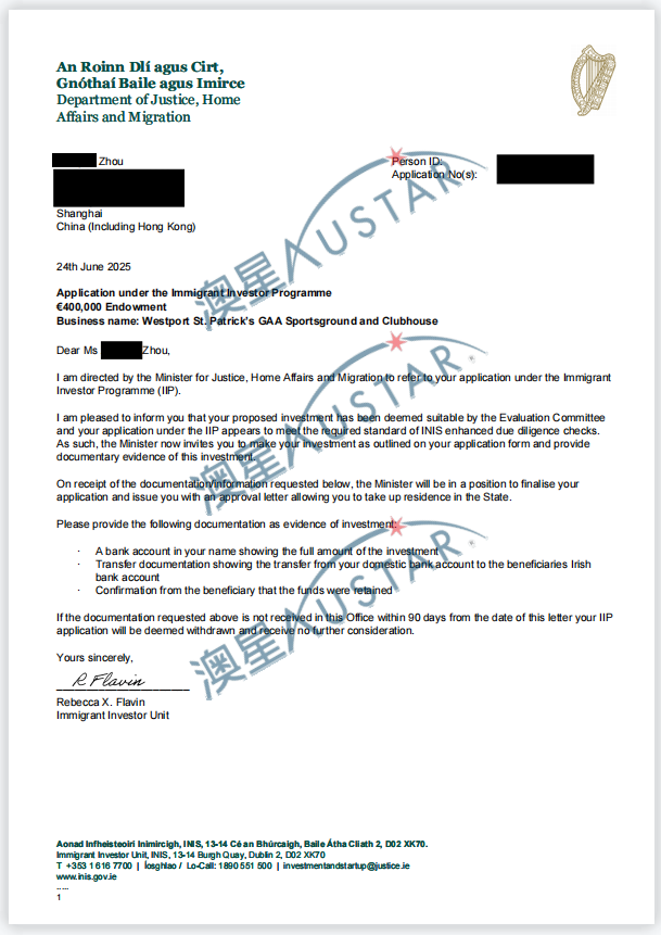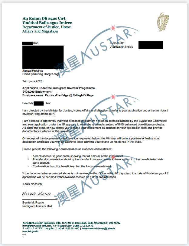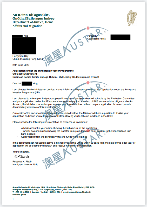 愛爾蘭移民局批簽雨再次襲來!澳星又有不少客戶收到了愛爾蘭的預(yù)批函!!! 目前收到的預(yù)批函總共有14封,主要是2022年10月-2023年5月遞交的申請,申請的都是愛爾蘭投資移民團捐類別【50萬歐元(團捐40萬)】,涉及5個項目,其中4個是之前已經(jīng)有預(yù)批的項目,1個是新批的項目。愛爾蘭投資移民是【先獲批后投資】,目前客戶正在準(zhǔn)備資金。
