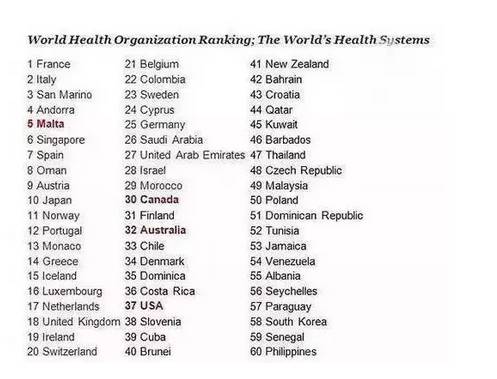 馬耳他在醫(yī)療設(shè)施和服務(wù)方面被世界健康組織(World Health Organization, WHO )認(rèn)可為排名世界第五位,排名較英國(18)、澳大利亞(32)、瑞典(32)、加拿大(30)、美國(37)更高。
