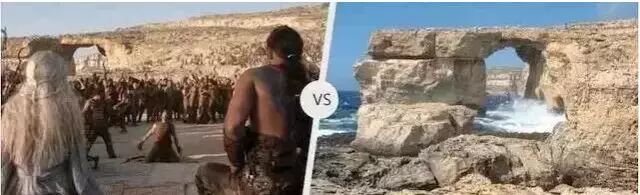《權(quán)力的游戲》在馬耳他多處地點(diǎn)選景。戈佐島藍(lán)窗,作為丹妮莉絲(龍母)的婚禮舉辦地。在戈佐島上,你可以發(fā)現(xiàn)這塊由石灰石形成的天然石拱,因?yàn)楹K那治g形成了洞的樣子。